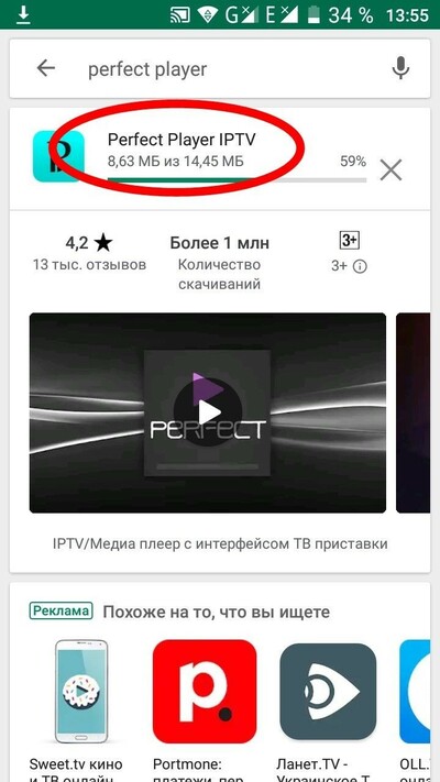 Теперь займёмся самим плеером. Найдём его в PlayMarket, написав в поисковой строке название «Perfect Рlayer» (латинскими буквами). Бирюзовая иконка с буквой «Р» не даст ошибиться и проинсталлировать другое приложение. Нажимаем кнопку «Установить»